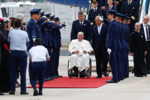 El jesuita argentino, que hace dos meses se sometió a una importante operación en el abdomen, recorrió en silla de ruedas la pista de aterrizaje, donde fue recibido por el presidente de Portugal, Marcelo Rebelo de Sousa, y varias autoridades.