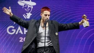 «Aguante la música argentina», dijo el artista, quien al subir al escenario para recibir su premio obtuvo el saludo virtual de Fito Páez, el anterior ganador del Gardel de Oro.